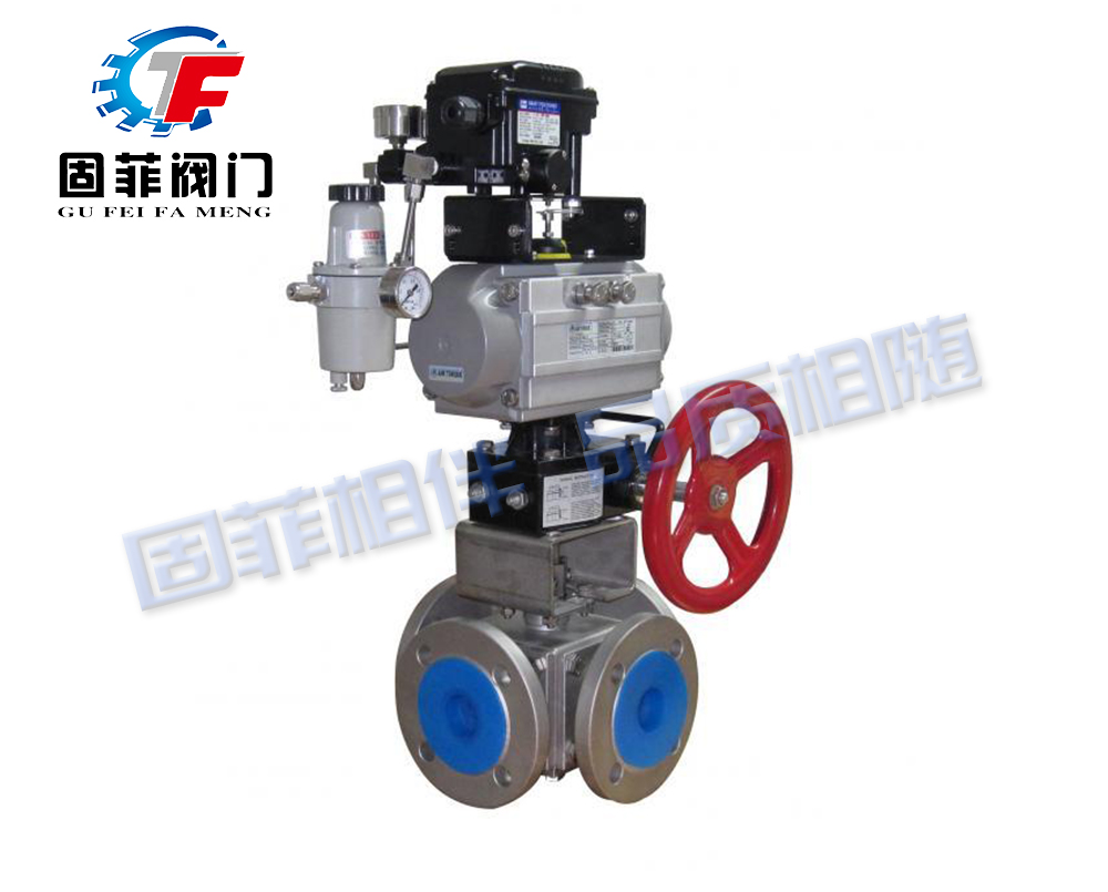 氣動(dòng)四通球閥密閉在各類管路系統(tǒng)種用于截?cái)嗷蚪油ń橘|(zhì)流,使介質(zhì)按照預(yù)定的程序輸送到各個(gè)指定點(diǎn)。氣動(dòng)四通球閥采用角行程氣動(dòng)執(zhí)行器及四通球閥組成,可配以閥門定位器輸入控制信號(hào)(4-20mADC或1-5VDC)氣源即可控制運(yùn)轉(zhuǎn)。亦可配行程限位開關(guān)、電磁閥、三聯(lián)件及0.4-0.7MPa氣源可實(shí)現(xiàn)開關(guān)操作,并送出二對(duì)無(wú)源觸點(diǎn)信號(hào)指示閥門的開關(guān)。