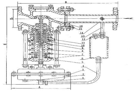 自力式調(diào)節(jié)閥是主要控制閥后壓力大小的一款閥門,閥門的作為方式為壓閉型。原理如下:介質(zhì)按照箭頭的方向流過閥體,并在閥芯、閥座受到節(jié)流后輸出。此外過蒸汽是由冷凝器冷卻溫度之后。壓力被引入執(zhí)行器并作用在在隔膜上,使得閥芯相應(yīng)地移位,從而達(dá)到降低壓力的目的。閥后設(shè)定壓力增加后,作用在隔膜上的力增加,壓縮彈簧,驅(qū)動閥芯,減小閥門開度直到閥門壓力下降到設(shè)定值。類似地,如果閥后面的壓力減小,則作用在膜片上的力減小,并且彈簧的作用力強(qiáng)制彈起,驅(qū)動閥芯,使閥門開度增大,直到閥門壓力上升到設(shè)定值。